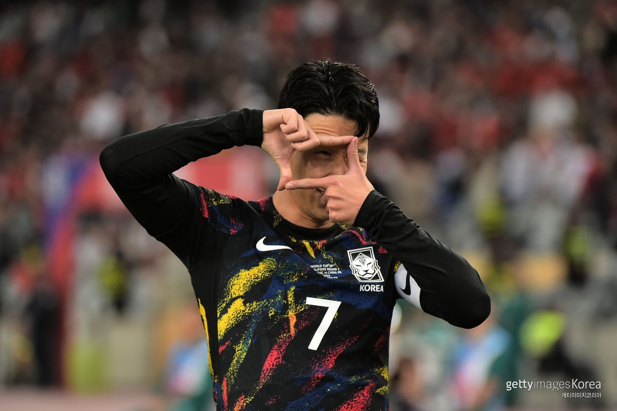 2023년 11월 21일 중국 광둥성 선전 유니버시아드 스포츠센터에서 열린 2026년 FIFA 월드컵 예선 C조 2차전 중국과 한국의 경기에서 한국의 손흥민 선수가 페널티킥으로 팀의 첫 골을 넣은 후 세리머니를 하고 있다.