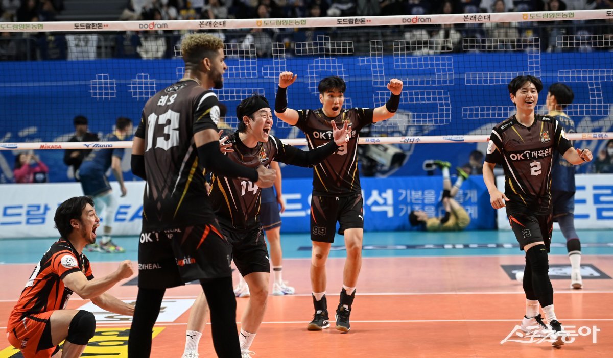 26일 서울 장충체육관에서 열린 ‘도드람 2023~2024 V-리그’ 남자부 우리카드와 OK금융그룹 경기에서 OK금융그룹 선수들이 서브 득점에 성공한 후 기뻐하고 있다.