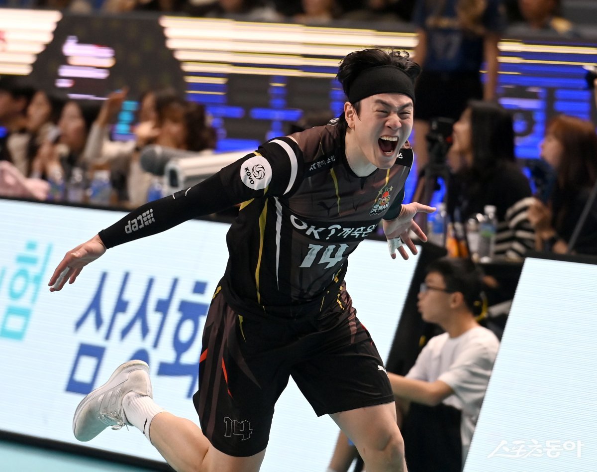 26일 서울 장충체육관에서 열린 ‘도드람 2023~2024 V-리그’ 남자부 우리카드와 OK금융그룹 경기에서 OK금융그룹 송희채가 공격 득점에 성공한 후 기뻐하고 있다.