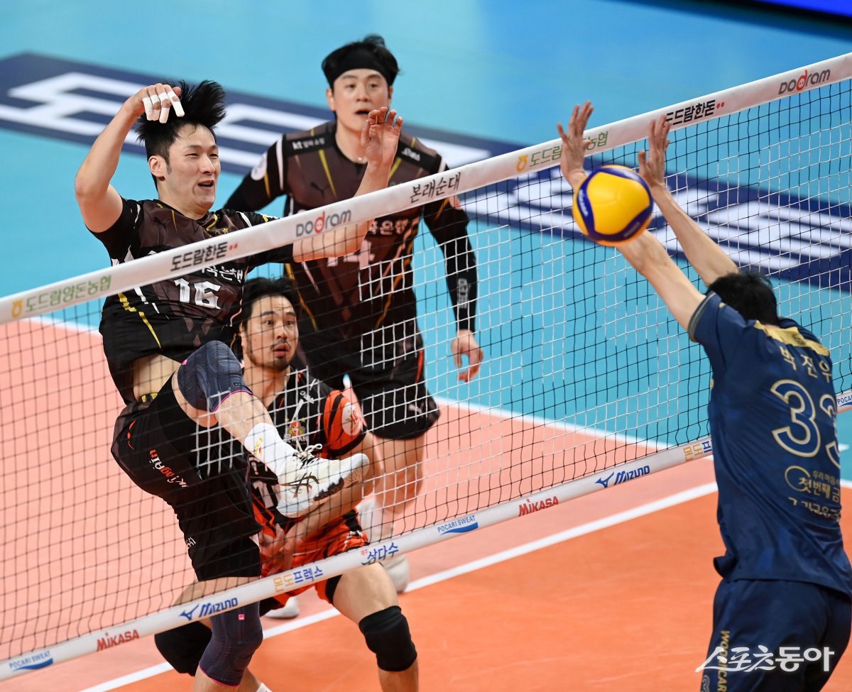 26일 서울 장충체육관에서 열린 ‘도드람 2023~2024 V-리그’ 남자부 우리카드와 OK금융그룹 경기에서 OK금융그룹 진상헌이 우리카드 리시브에 직접 넘어온 공을 때리고 있다.