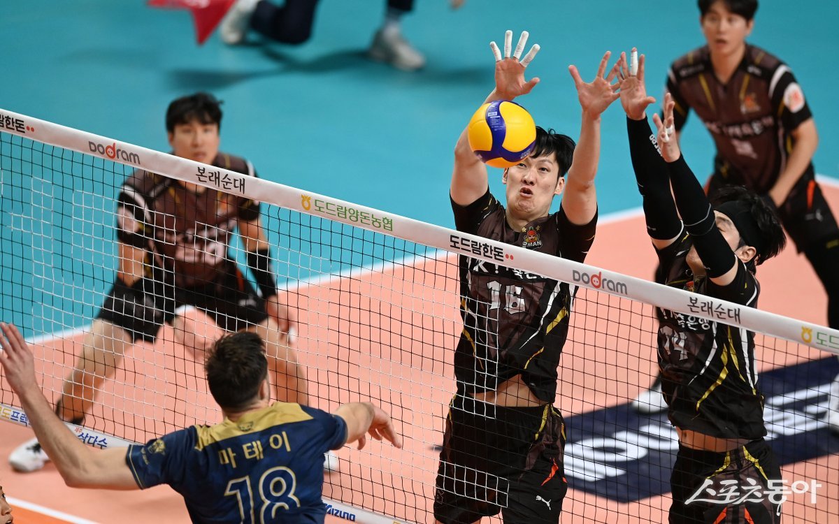 26일 서울 장충체육관에서 열린 ‘도드람 2023~2024 V-리그’ 남자부 우리카드와 OK금융그룹 경기에서 OK금융그룹 진상헌이 블로킹에 성공하고 있다.