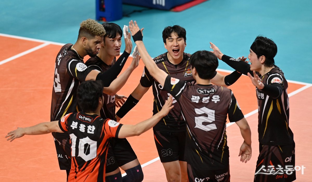 26일 서울 장충체육관에서 열린 ‘도드람 2023~2024 V-리그’ 남자부 우리카드와 OK금융그룹 경기에서 OK금융그룹 선수들이 1세트를 승리한 후 기뻐하고 있다.