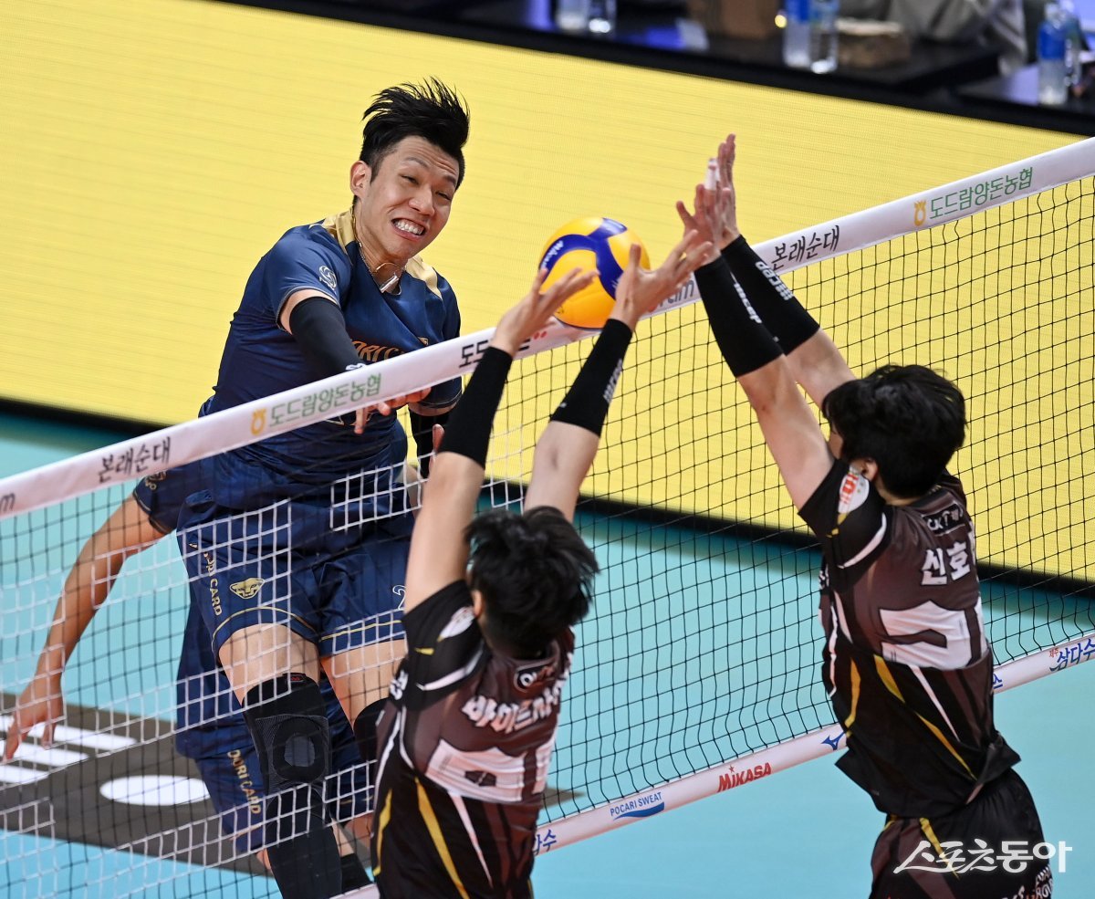 26일 서울 장충체육관에서 열린 ‘도드람 2023~2024 V-리그’ 남자부 우리카드와 OK금융그룹 경기에서 우리카드 잇세이가 OK금융그룹의 블로킹 사이로 스파이크를 날리고 있다.