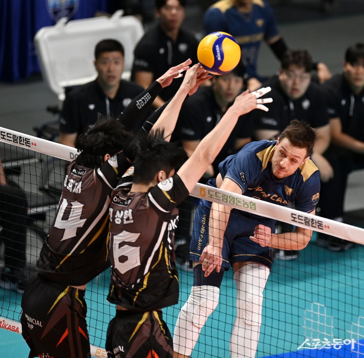 26일 서울 장충체육관에서 열린 ‘도드람 2023~2024 V-리그’ 남자부 우리카드와 OK금융그룹 경기에서 우리카드 마테이가 OK금융그룹의 블로킹 사이로 스파이크를 날리고 있다.