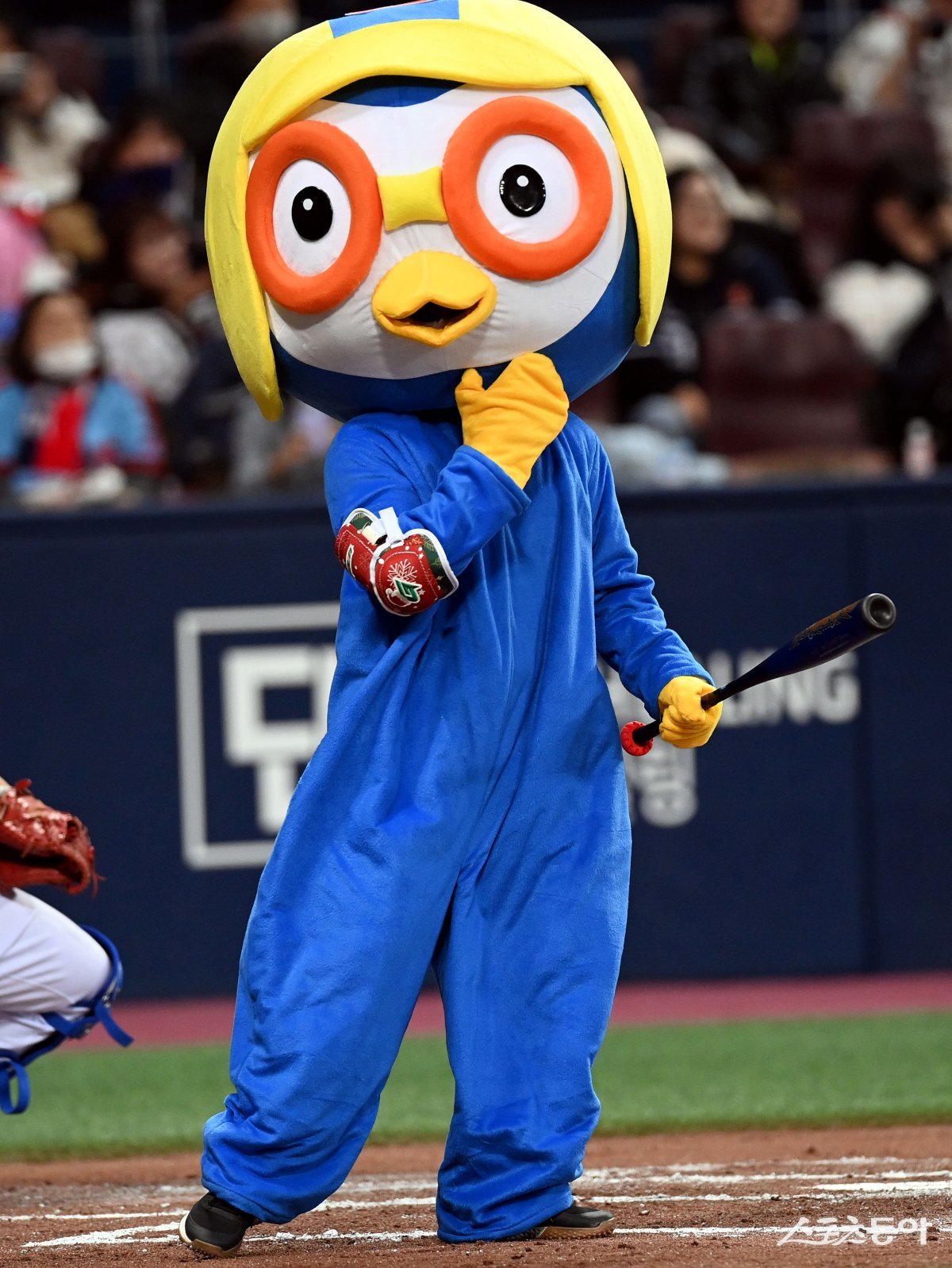 26일 서울 고척스카이돔에서 ‘2023 희망더하기 자선야구대회’가 열렸다. 양신 김민수가 뽀로로 분장으로 타석에 들어서고 있다.
