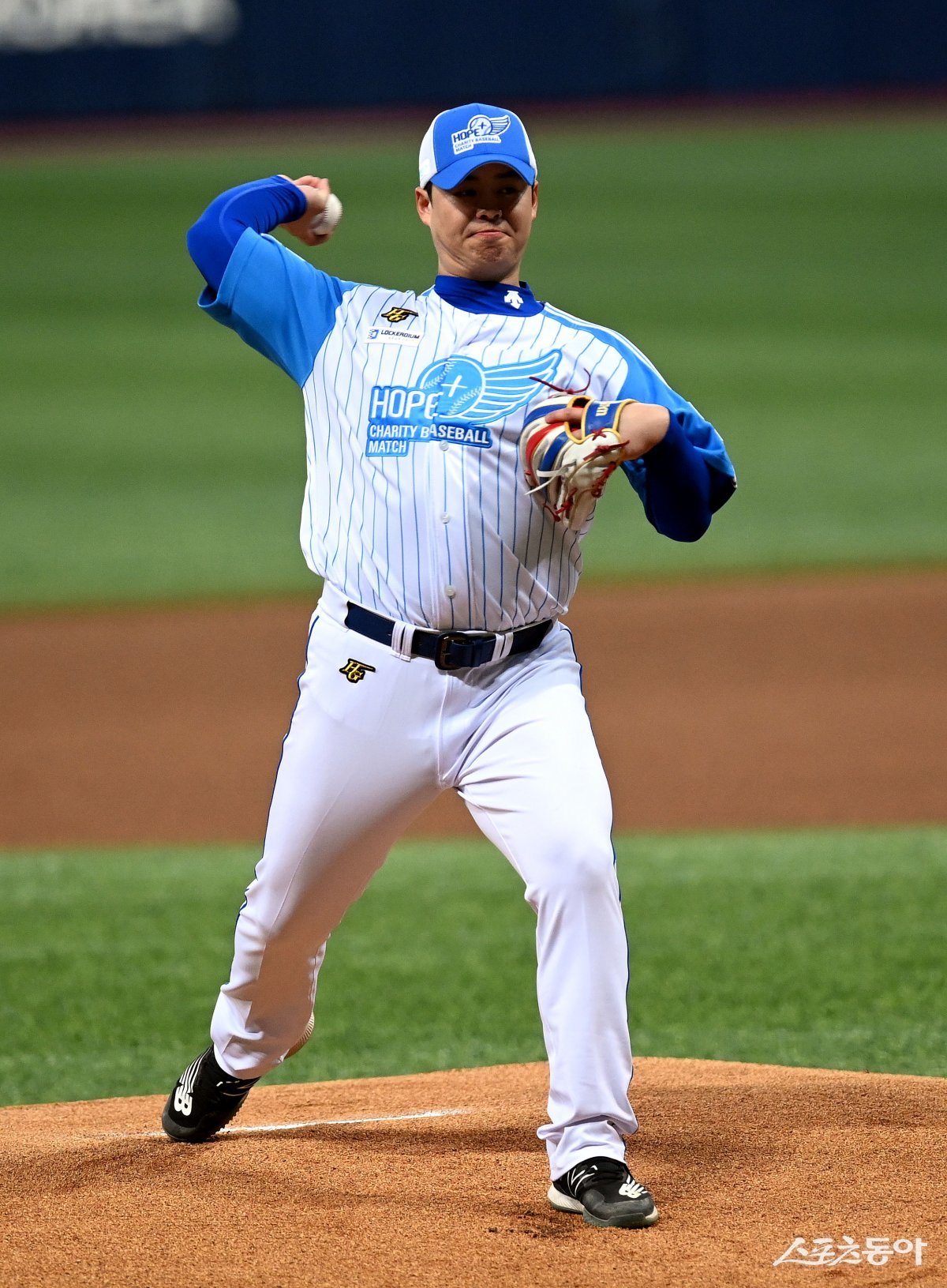 26일 서울 고척스카이돔에서 ‘2023 희망더하기 자선야구대회’가 열렸다. 양신 선발투수 노시환이 힘차게 볼을 던지고 있다.