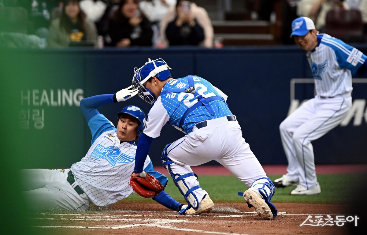 26일 서울 고척스카이돔에서 ‘2023 희망더하기 자선야구대회’가 열렸다. 양신 정철원이 안타 때 홈 득점을 노렸으나 김동헌에게 태그아웃되고 있다.