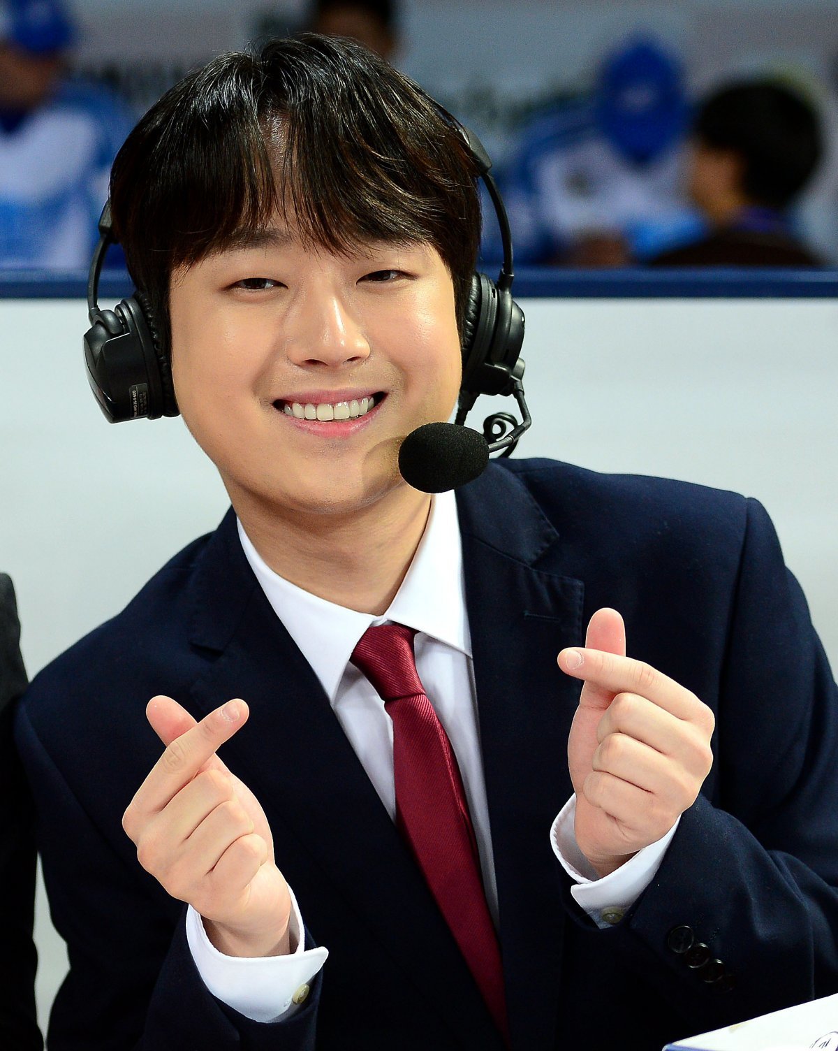 26일 서울 고척스카이돔에서 ‘2023 희망더하기 자선야구대회’가 열렸다. 이찬원 해설위원이 카메라를 향해 포즈를 취하고 있다.