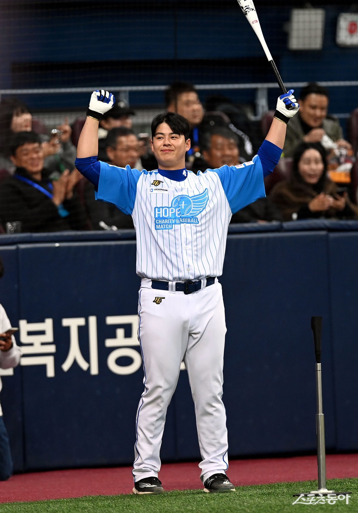 26일 서울 고척스카이돔에서 ‘2023 희망더하기 자선야구대회’가 열렸다. 양신 노시환이 홈런레이스 참석해 홈런을 쏘아 올린 후 세리머니를 펼치고 있다.