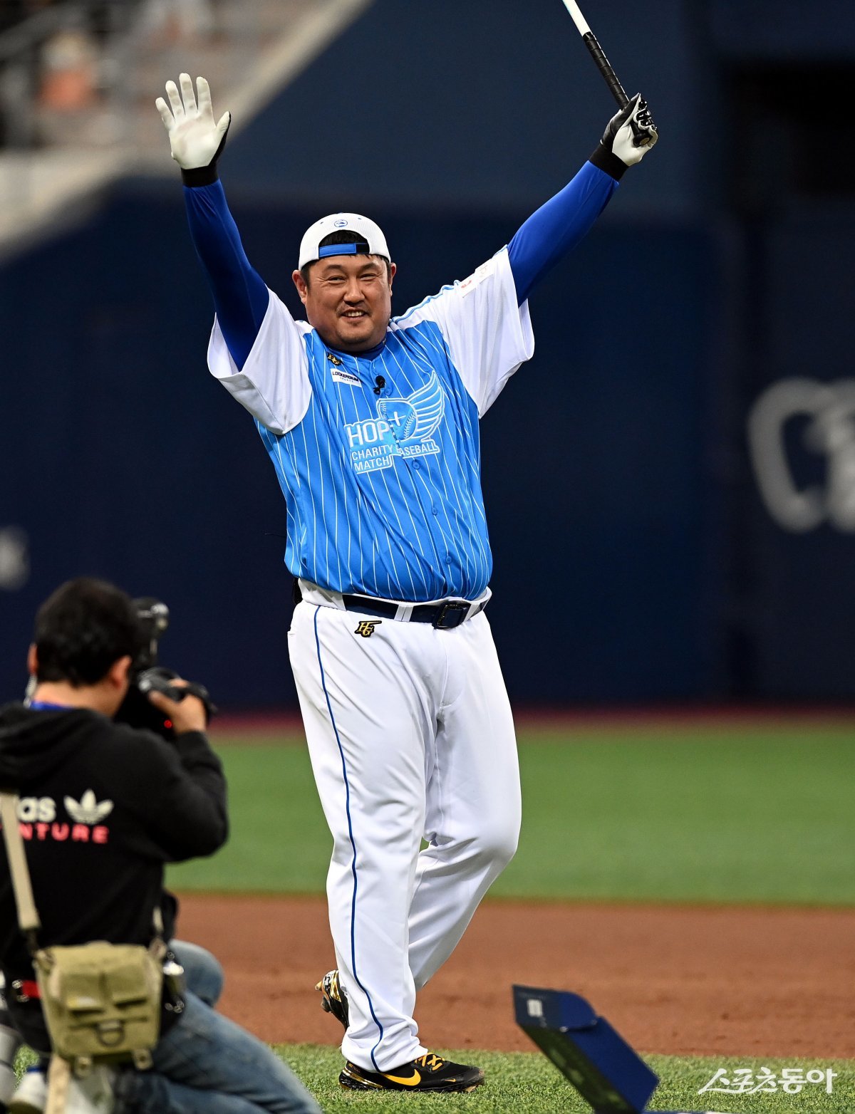 26일 서울 고척스카이돔에서 ‘2023 희망더하기 자선야구대회’가 열렸다. 종범신 최준석이 홈런레이스 참석해 홈런을 쏘아 올린 후 세리머니를 펼치고 있다.