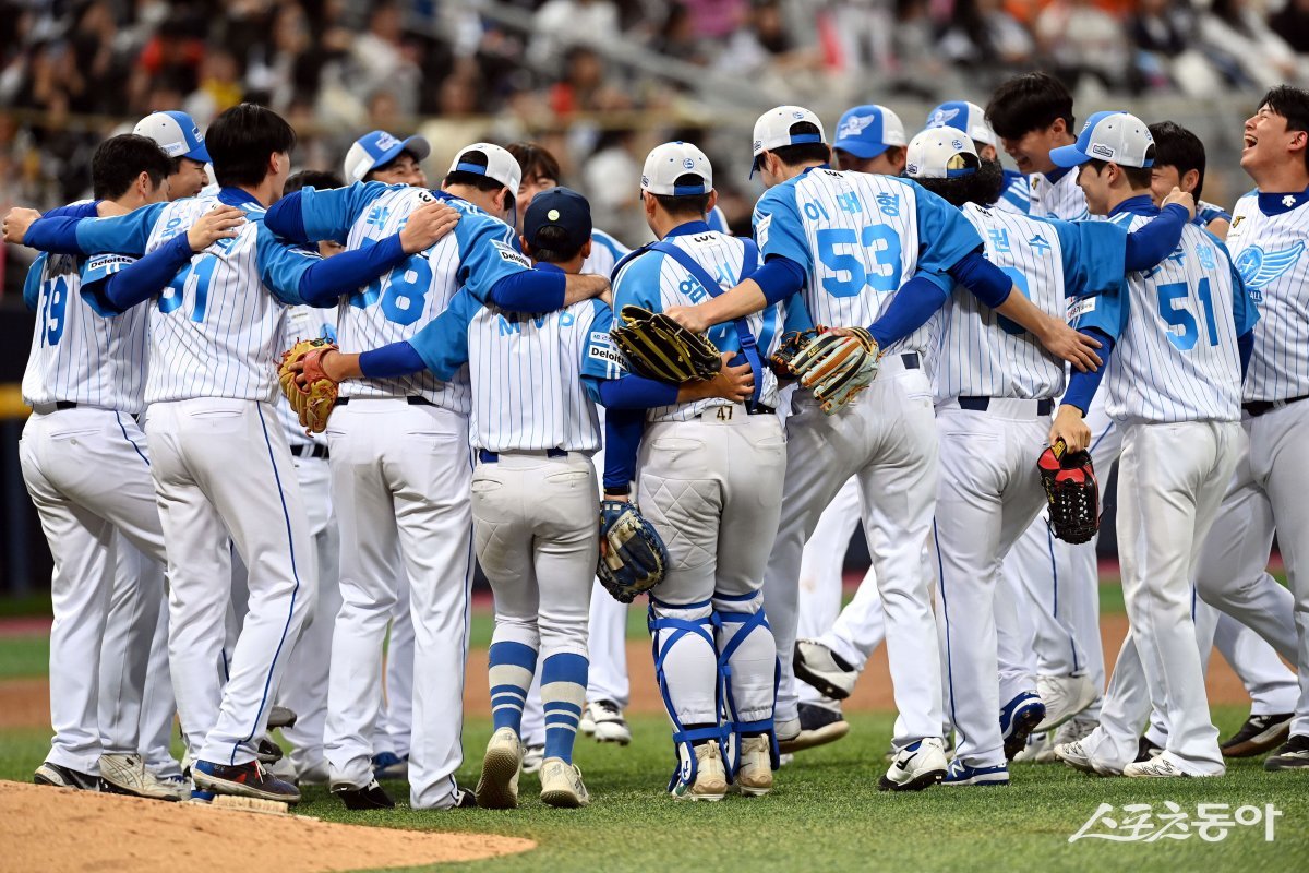 26일 서울 고척스카이돔에서 ‘2023 희망더하기 자선야구대회’가 열렸다. 양신 팀이 종범신 팀 상대로 13-9 승리한 후 선수들이 그라운드에서 기쁨을 나누고 있다.
