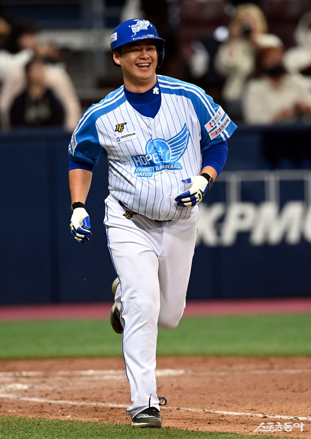 26일 서울 고척스카이돔에서 ‘2023 희망더하기 자선야구대회’가 열렸다. 이대호 타격을 따라한 양신 팀 노시환이 타격 후 1루로 진루하고 있다.