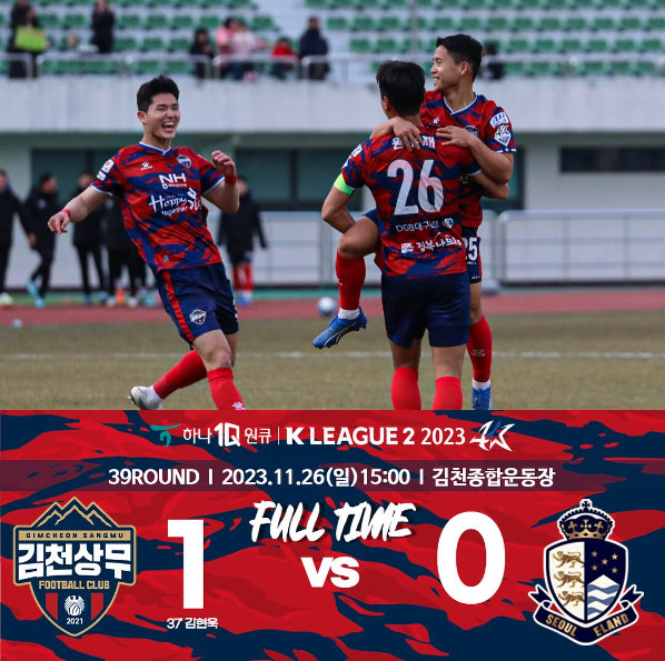 김천은 26일 김천종합운동장에서 열린 하나원큐 K리그2 2023 39라운드 최종전에서 서울 이랜드에 1-0으로 승리했다. 전반 37분 김현욱이 천금 같은 결승골을 터뜨렸다.