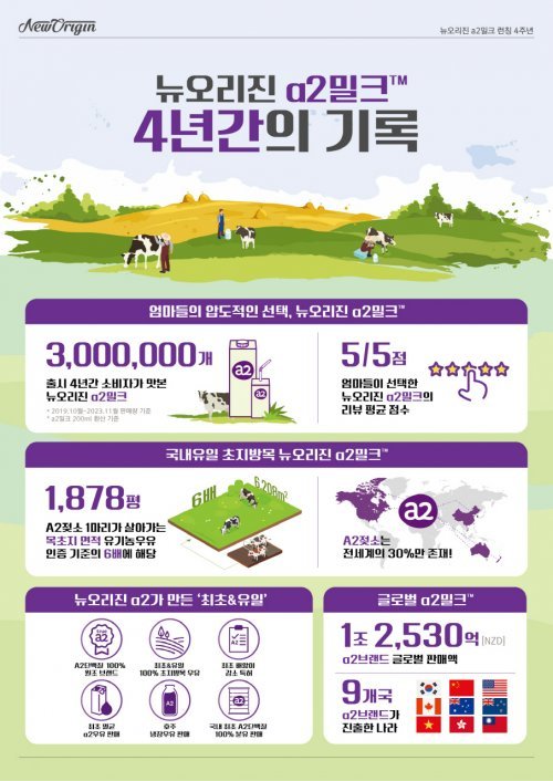 뉴오리진 a2는 호주 프리미엄 유가공 업체인 a2 밀크 컴퍼니와의 독점 수입 계약을 통해, A2 단백질 100%를 함유한 우유와 분유를 내놓았다. 론칭 4주년 기념 인포그래픽에는 뉴오리진 a2밀크, A2젖소, a2밀크가 세운 기록, 글로벌 a2라는 주제 아래 뉴오리진 a2밀크 4년간의 기록을 담았다.