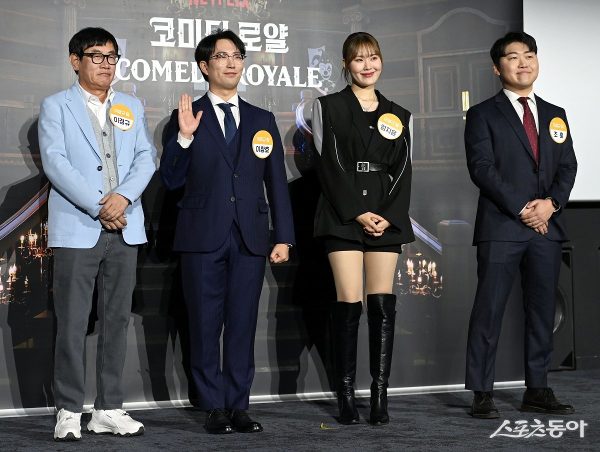 27일 서울 메가박스 성수에서 열린 넷플릭스 예능 ‘코메디 로얄’ 제작발표회에서 이경규팀 이창호, 엄지윤, 조훈이 포토타임을 갖고 있다.