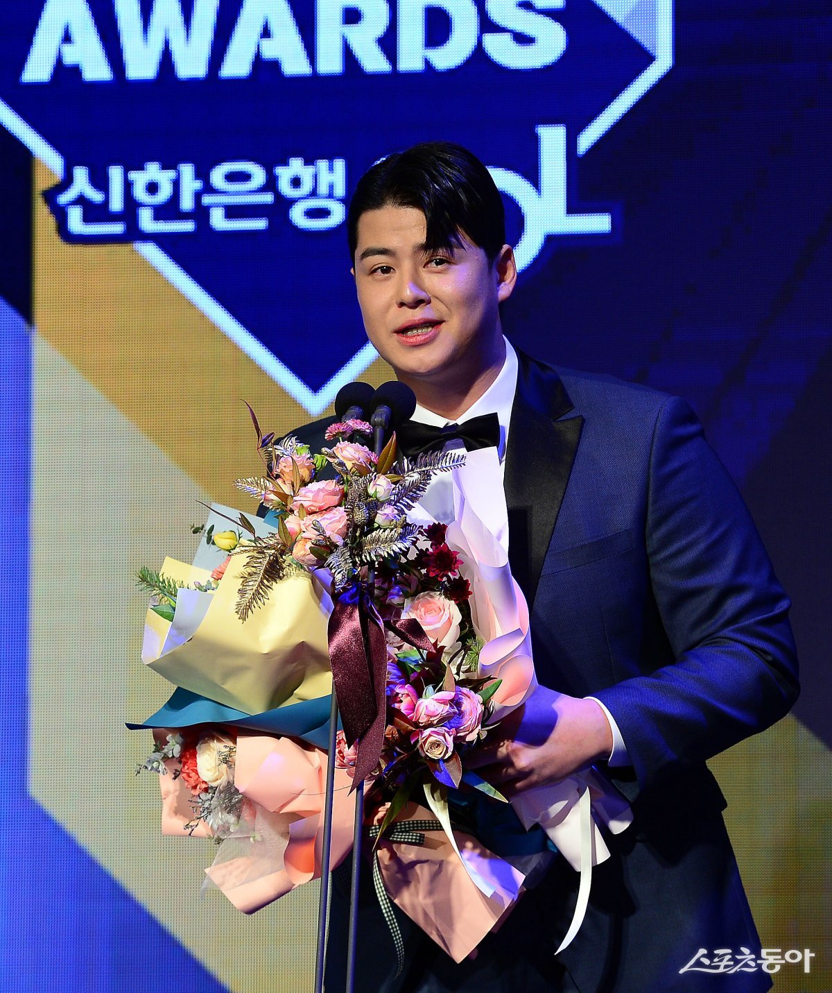 27일 서울 중구 소공동 웨스틴조선호텔에서 ‘2023 신한은행 SOL KBO 시상식’이 열렸다. KBO 타점, 홈런상 수상한 한화 노시환이 소감을 밝히고 있다.