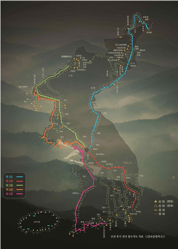 ‘증보문헌비고(1908년)’에 따르면 조선 후기 중앙정부는 5개의 직봉, 23개의 간봉 노선을 운영했다. 전체 노선에는 총 622개 봉수가 존재했다. 그 중 부산 응봉과 서울 목멱산 제2봉수를 연결하는 ‘제2로 직봉’, 여수 돌산도에서 서울 목멱산 제5봉수를 연결하는 ‘제5로 직봉’이 남한에 위치하고 있고, 나머지 3개 직봉 노선은 북한에 위치하고 있다. ‘증보문헌비고’는 대한제국에서 1790년 이후 변경된 국가제도에 관한 사항을 반영하기 위해 ‘문헌비고’를 수정·보완해 간행한 책이다. 간봉(間峯)은 직봉 노선의 단절을 우려해 이를 보조하기 위해 설치한 보조선로에 위치한 봉수다.