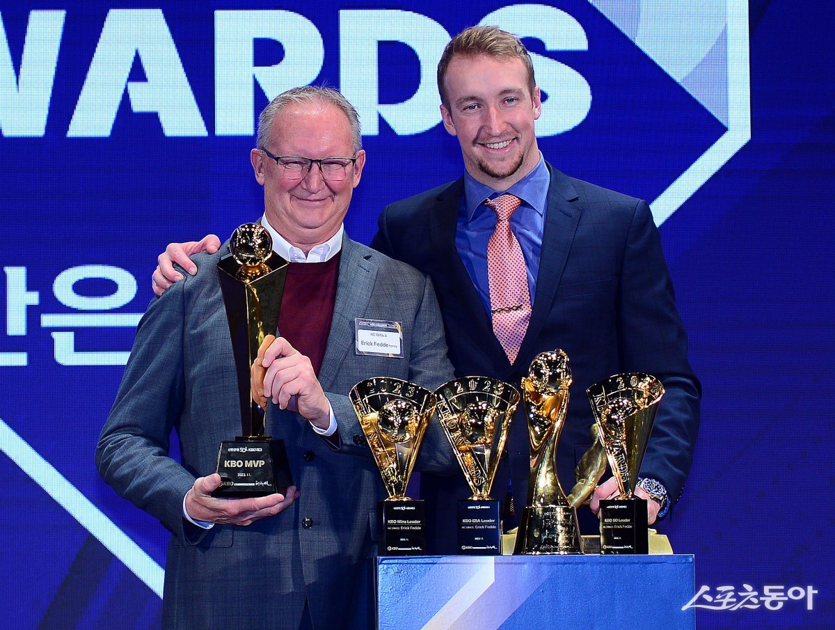 27일 서울 중구 소공동 웨스틴조선호텔에서 ‘2023 신한은행 SOL KBO 시상식’이 열렸다. MVP을 수상한 NC 페디가 아버지 스캇 페디와 포즈를 취하고 있다.