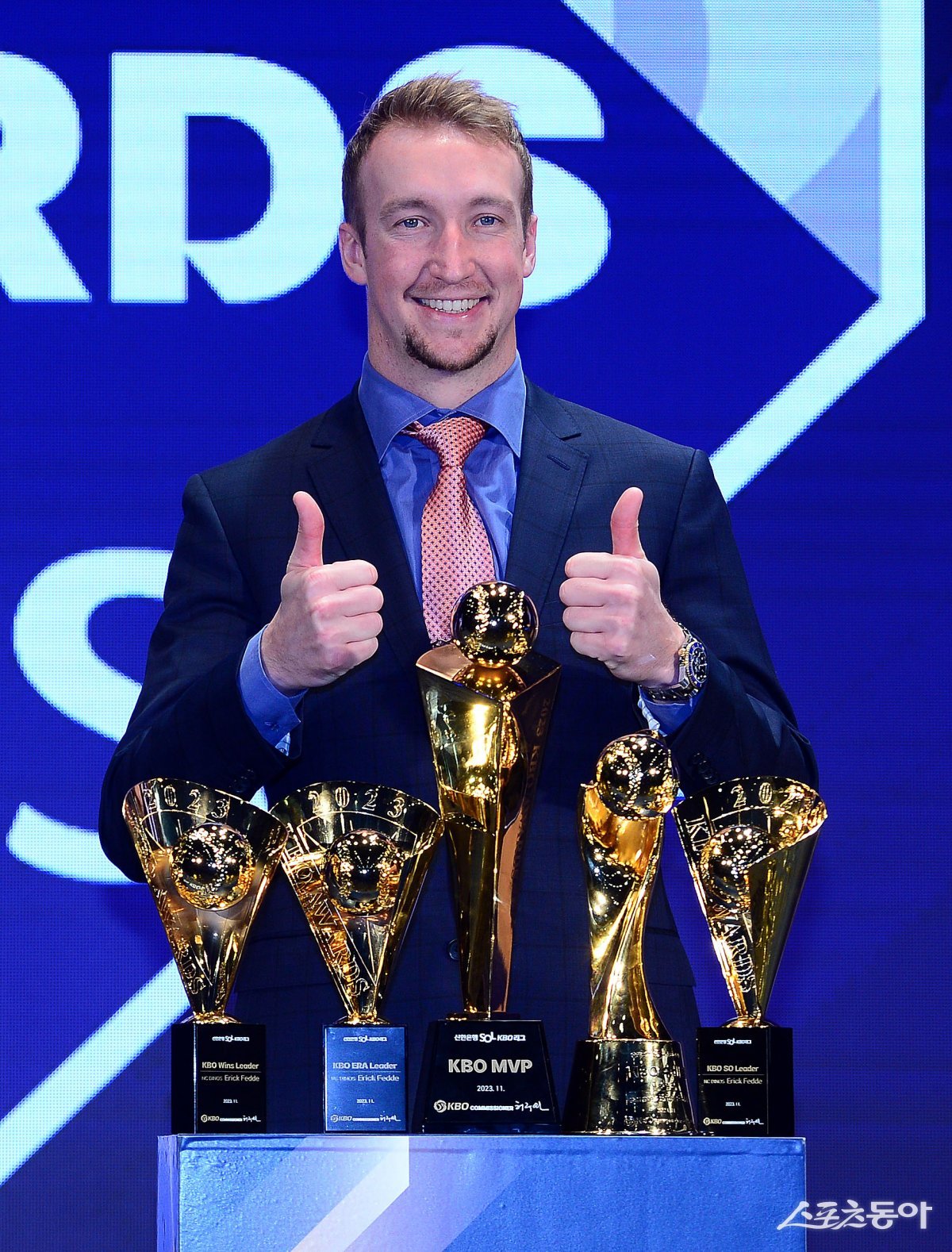 27일 서울 중구 소공동 웨스틴조선호텔에서 ‘2023 신한은행 SOL KBO 시상식’이 열렸다. MVP을 수상한 NC 페디가 포즈를 취하고 있다.