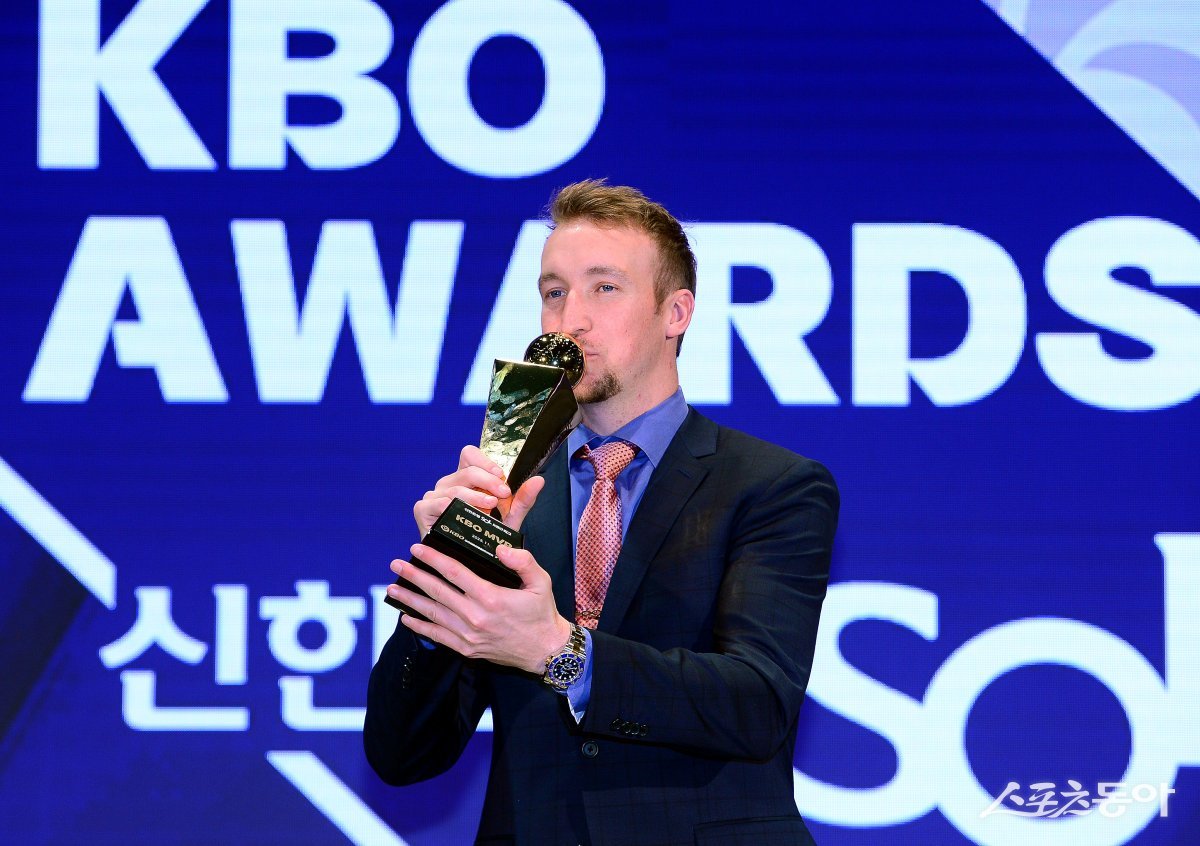 27일 서울 중구 소공동 웨스틴조선호텔에서 ‘2023 신한은행 SOL KBO 시상식’이 열렸다. MVP를 수상한 NC 페디가 트로피에 키스를 하고 있다.