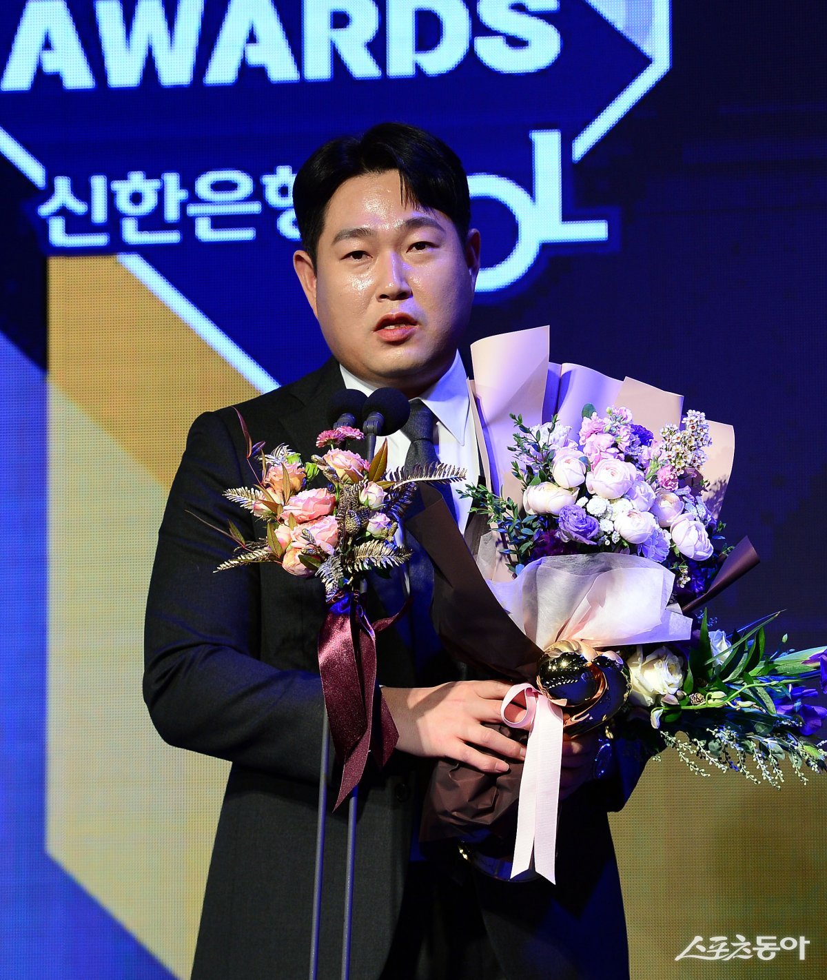 27일 서울 중구 소공동 웨스틴조선호텔에서 ‘2023 신한은행 SOL KBO 시상식’이 열렸다. KBO 수비상 포수부문을 수상한 두산 양의지가 소감을 밝히고 있다.