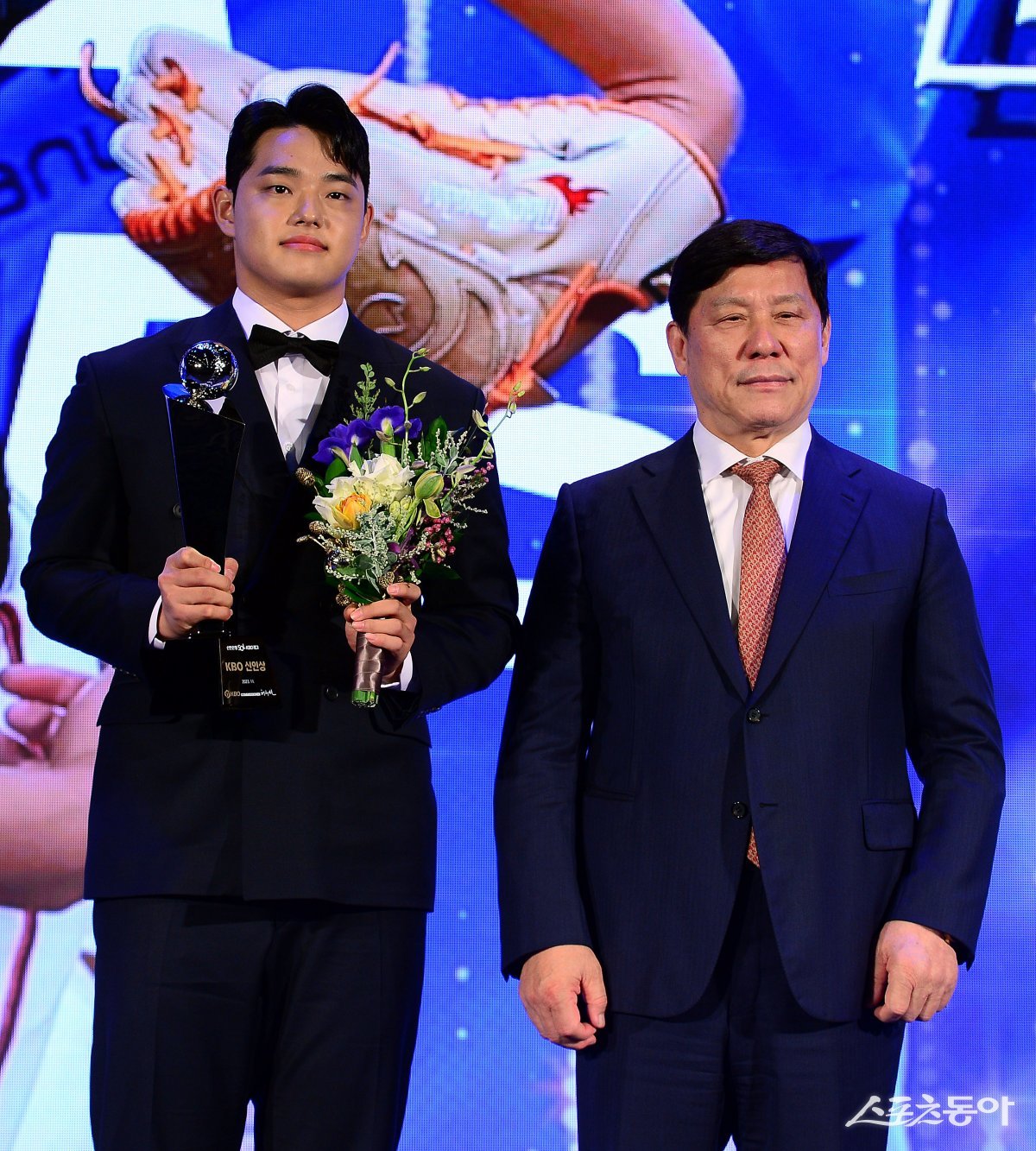 27일 서울 중구 소공동 웨스틴조선호텔에서 ‘2023 신한은행 SOL KBO 시상식’이 열렸다. KBO 신인상을 수상한 한화 문동주가 허구연 KBO총재와 기념촬영을 하고 있다.