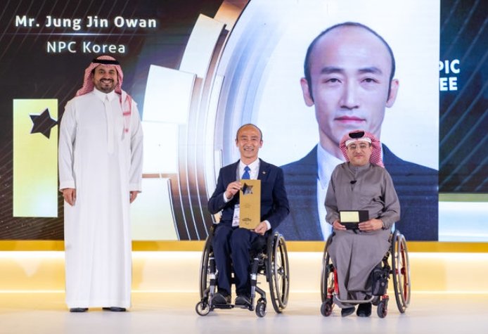 정진완 대한장애인체육회장이 지난 25일 사우디아라비아 리야드에서 열린 2023 아시아패럴림픽위원회(APC) 시상식에서 아시아 훈장을 받았다. 아시아 훈장은 아시아지역 패럴림픽 무브먼트(운동·캠페인)와 장애인체육 발전에 기여한 인물 또는 기관에 2년마다 수여하는 최고 영예의 상이다. 정 회장은 약 30년 동안 국내외 장애인체육 발전과 선수중심의 가치 실현, 패럴림픽 무브먼트 확산에 기여한 공로를 인정받았다.
