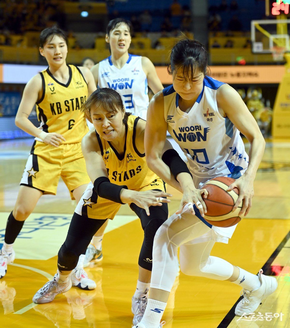 27일 청주체육관에서 열린 ‘우리은행 우리WON 2023~24 여자프로농구’ KB스타즈와 우리은행 경기에서 우리은행 고아라와 KB스타즈 염윤아가 리바운드 볼을 다투고 있다.