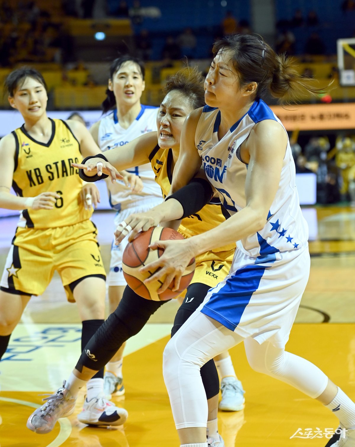 27일 청주체육관에서 열린 ‘우리은행 우리WON 2023~24 여자프로농구’ KB스타즈와 우리은행 경기에서 우리은행 고아라와 KB스타즈 염윤아가 리바운드 볼을 다투고 있다.