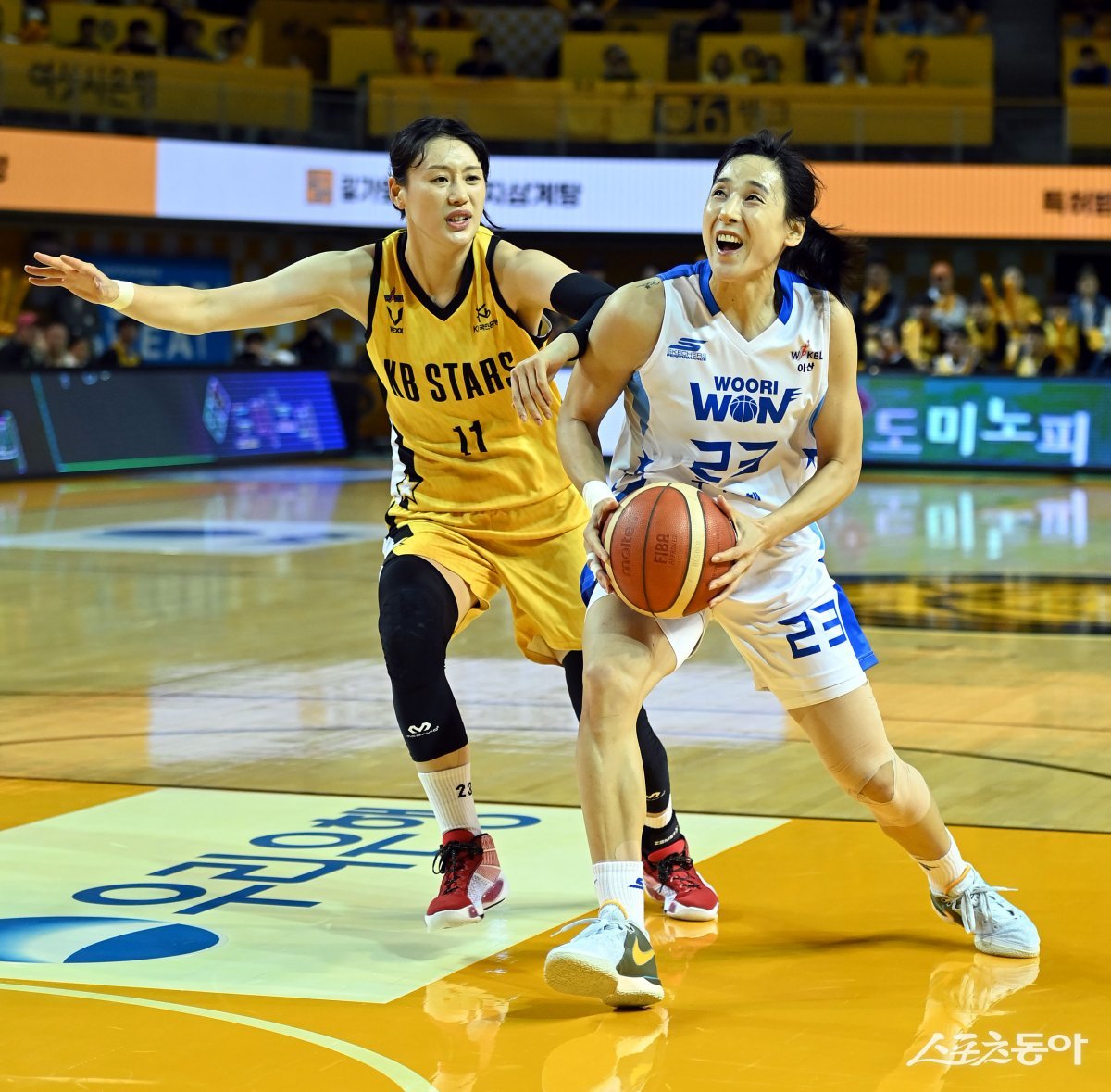 27일 청주체육관에서 열린 ‘우리은행 우리WON 2023~24 여자프로농구’ KB스타즈와 우리은행 경기에서 우리은행 김단비가 KB스타즈 강이슬의 수비를 뚫고 골밑을 공격하고 있다.