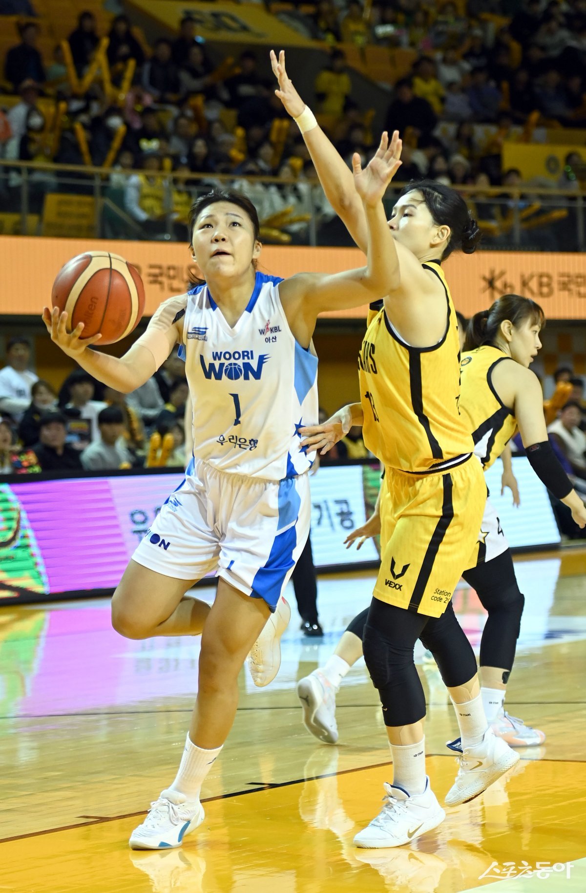 27일 청주체육관에서 열린 ‘우리은행 우리WON 2023~24 여자프로농구’ KB스타즈와 우리은행 경기에서 우리은행 박지현이 KB스타즈의 수비를 뚫고 골밑을 공격하고 있다.
