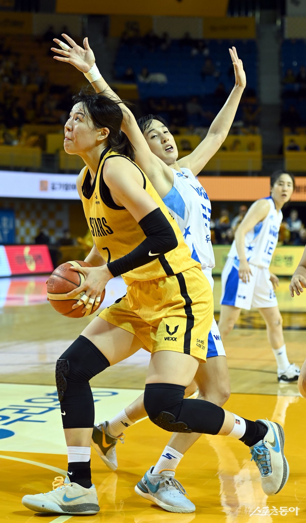 27일 청주체육관에서 열린 ‘우리은행 우리WON 2023~24 여자프로농구’ KB스타즈와 우리은행 경기에서 KB스타즈 박지수가 우리은행의 수비를 뚫고 골밑을 공격하고 있다.