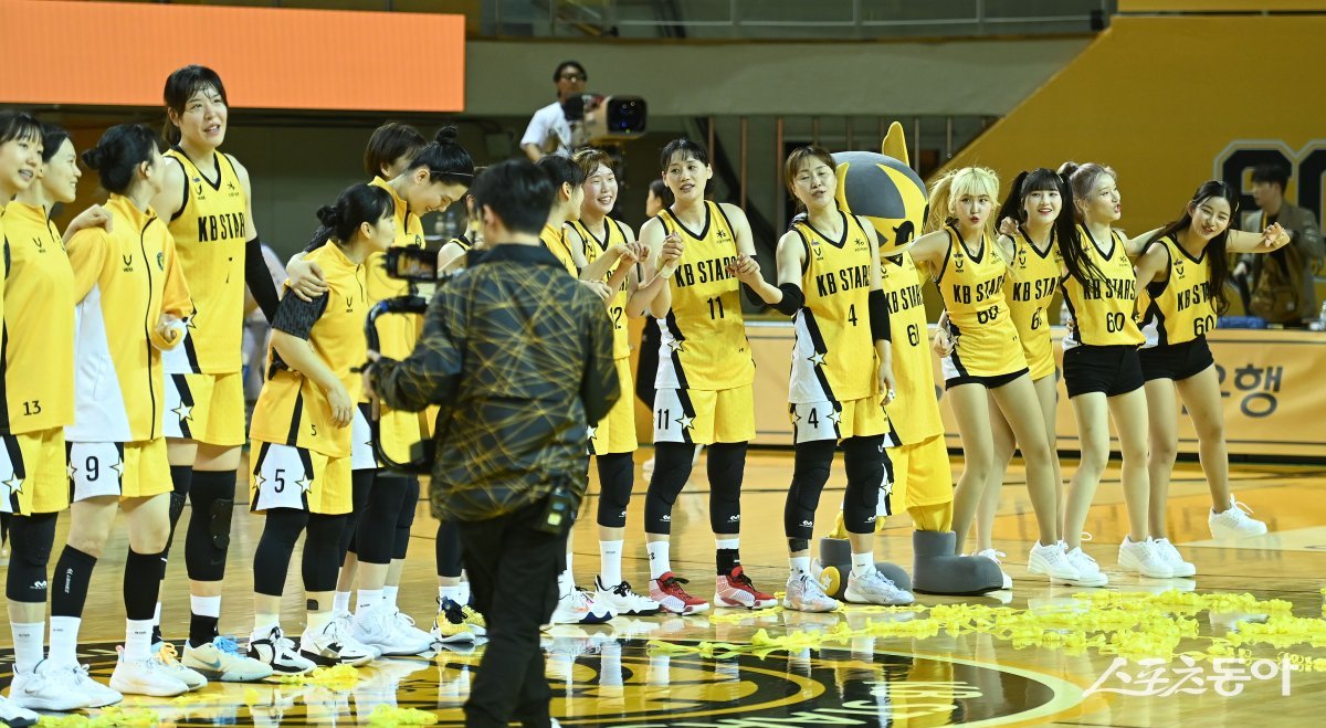 27일 청주체육관에서 열린 ‘우리은행 우리WON 2023~24 여자프로농구’ KB스타즈와 우리은행 경기에서 50-45 승리를 거두며 우리은행의 7연승을 저지한 KB스타즈 선수들이 기뻐하고 있다.
