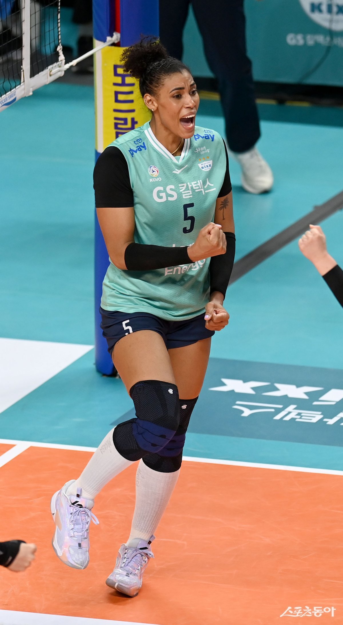 29일 서울 장충체육관에서 열린 ‘도드람 2023~2024 V-리그’ 여자부 GS칼텍스와 IBK기업은행 경기에서 GS칼텍스 실바가 공격 득점에 성공한 후 기뻐하고 있다.