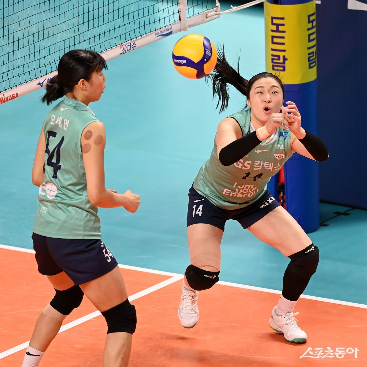 29일 서울 장충체육관에서 열린 ‘도드람 2023~2024 V-리그’ 여자부 GS칼텍스와 IBK기업은행 경기에서 GS칼텍스 김지원이 디그를 하고 있다.