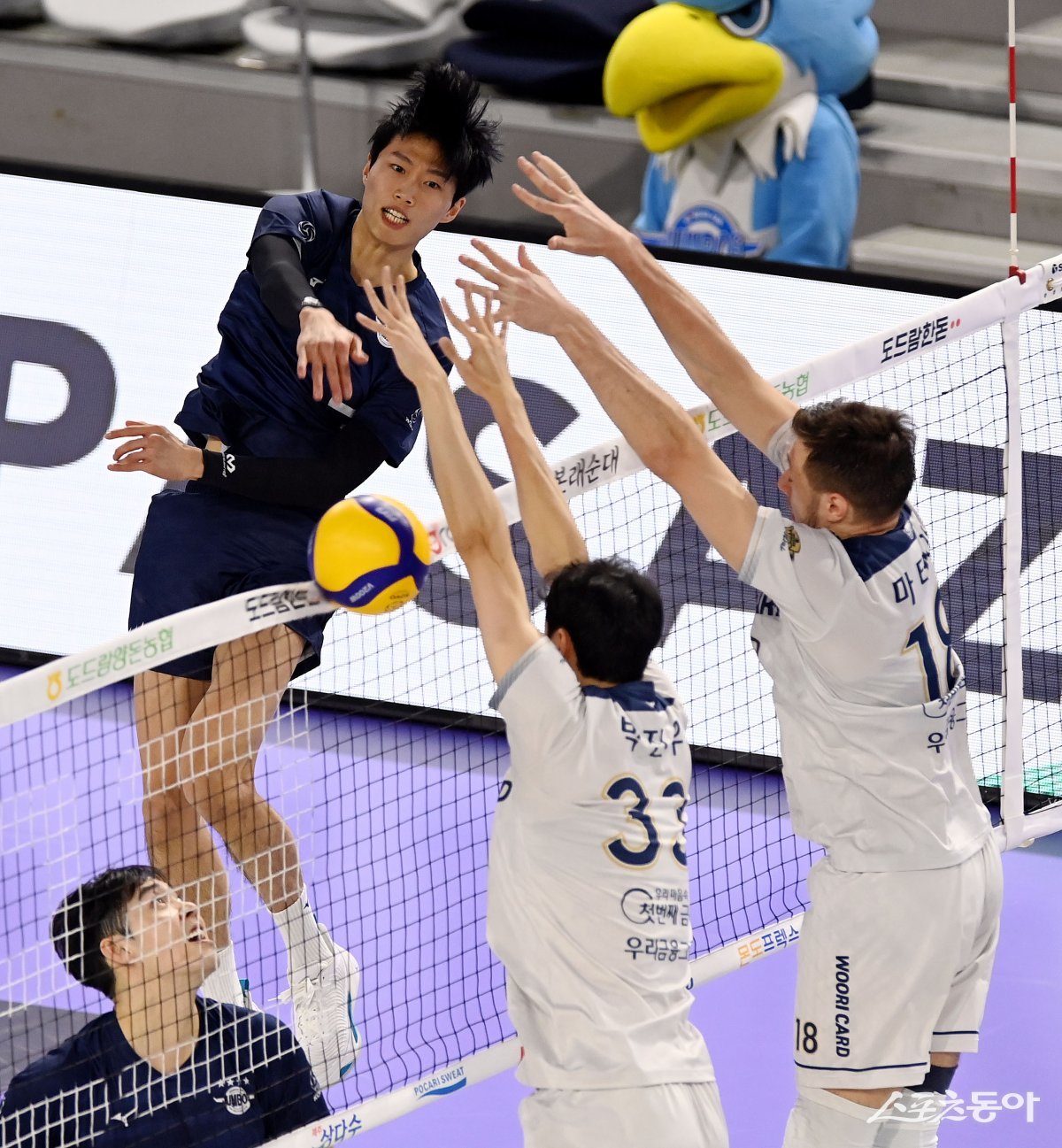 30일 인천 계양체육관에서 ‘2023-2024 도드람 V리그’ 인천 대한항공과 서울 우리카드의 남자부 경기가 열렸다. 대한항공 이준이 우리카드 블로커를 피해 스파이크를 날리고 있다.