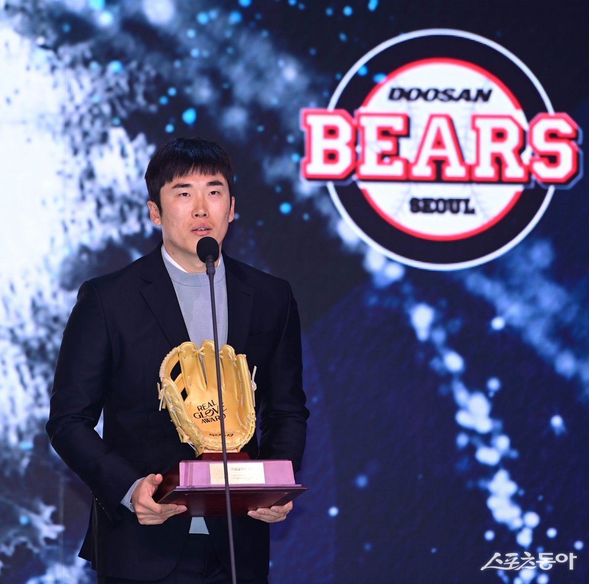 1일 서울 용산구 한남동 그랜드하얏트서울에서 열린 ‘2023 마구마구 리얼글러브 어워드’에서 3루수 부문을 수상한 두산 허경민이 소감을 말하고 있다.