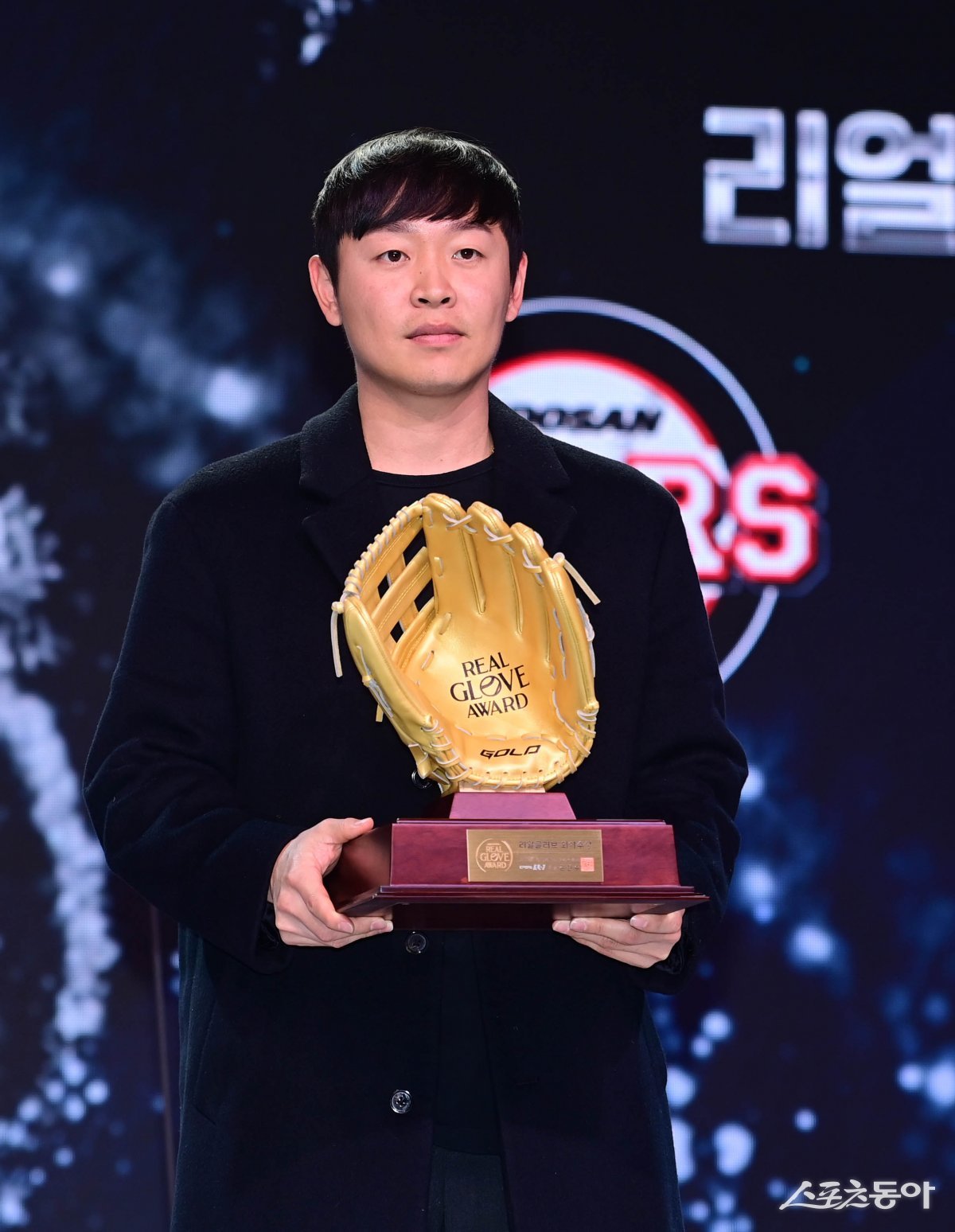 1일 서울 용산구 한남동 그랜드하얏트서울에서 열린 ‘2023 마구마구 리얼글러브 어워드’에서 외야수 부문을 수상한 두산 정수빈이 기념 촬영을 하고 있다.