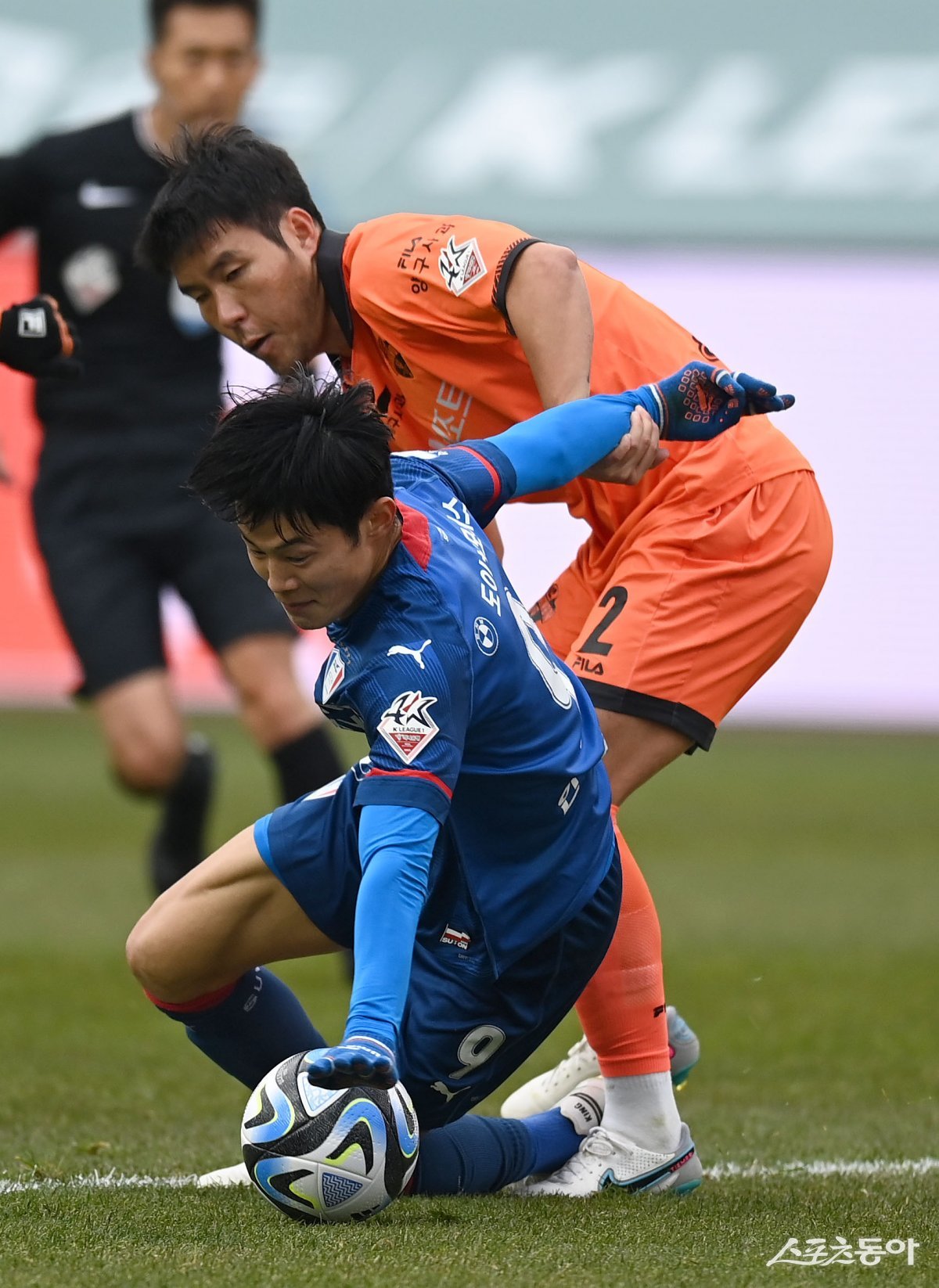 2일 수원월드컵경기장에서 열린 프로축구 ‘하나원큐 K리그1 2023’ 파이널B 수원 삼성과 강원 경기에서 수원 삼성 안병준과 강원 김영빈이 볼다툼을 하고 있다.
