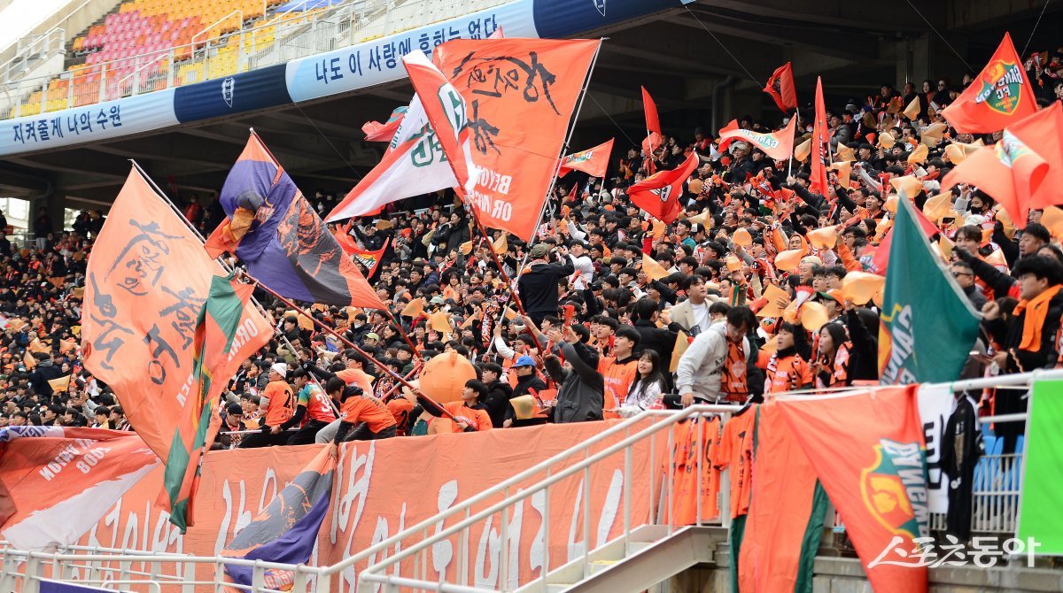 2일 수원월드컵경기장에서 열린 프로축구 ‘하나원큐 K리그1 2023’ 파이널B 수원 삼성과 강원 경기에서 강원 서포터즈가 응원을 펼치고 있다.