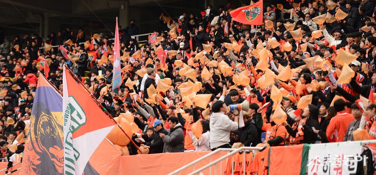 2일 수원월드컵경기장에서 열린 프로축구 ‘하나원큐 K리그1 2023’ 파이널B 수원 삼성과 강원 경기에서 강원 서포터즈가 응원을 펼치고 있다.