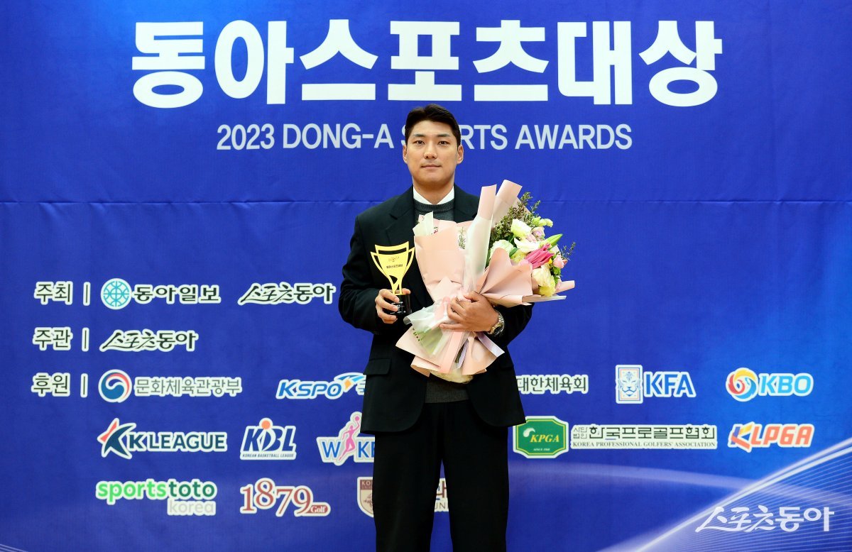 스포츠동아가 동아일보, 채널A와 공동으로 주최하고 국내 5대 프로스포츠(프로야구·프로축구·남녀프로농구·남녀프로배구·남녀프로골프) 종목별로 올 한해를 빛낸 최고의 선수를 선정하는 ‘2023 동아스포츠대상‘ 시상식이 5일 서울 성북구 고려대학교 백주년기념관에서 개최됐다. 프로축구 올해의 선수상을 수상한 주민규(울산 현대)가 기념촬영을 하고 있다.