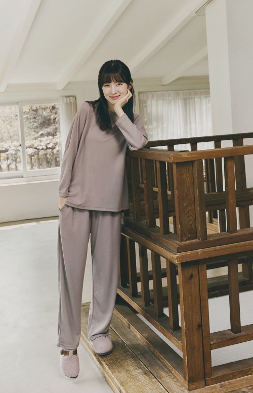 라운지 세트는 부드럽고 보온성이 좋은 니트 소재의 라운지웨어 티셔츠와 라운지 팬츠로 구성했다. 블랙, 모카 2가지 기본 색상으로 데일리 룩 연출로도 좋다.