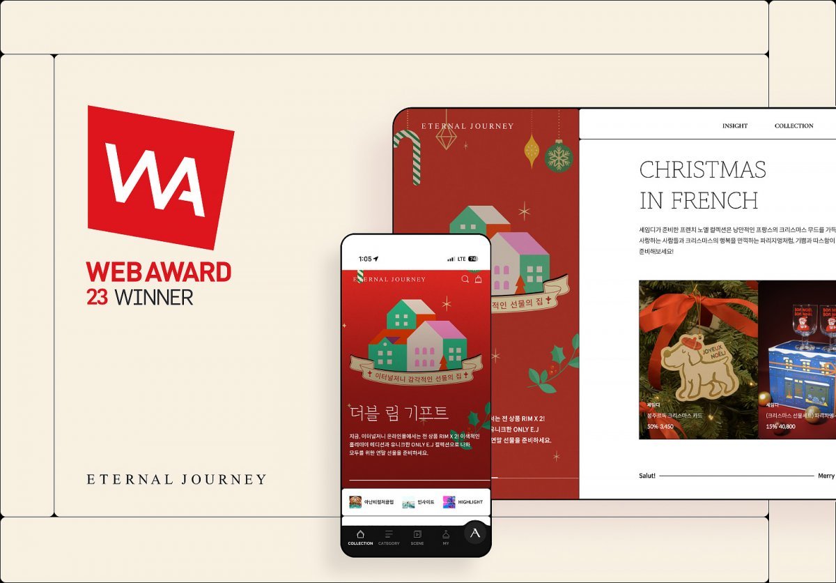‘웹어워드 코리아 2023’은 비주얼 디자인, UI 디자인, 기술, 콘텐츠, 마케팅, 서비스 측면에서 혁신적이고 우수한 서비스를 선정하는 시상식이다. 4월 오픈한 이터널저니 온라인몰은 웹어워드 코리아 2023 시상식에서 6개 부문 18개 평가지표를 토대로 우수한 평가를 받아 모바일 UI/UX 이노베이션 대상을 수상했다. 독창적인 비주얼 디자인과 사용자 경험에 초점을 맞춘 풍부한 콘텐츠 구성에서 우수한 평가를 받았다.