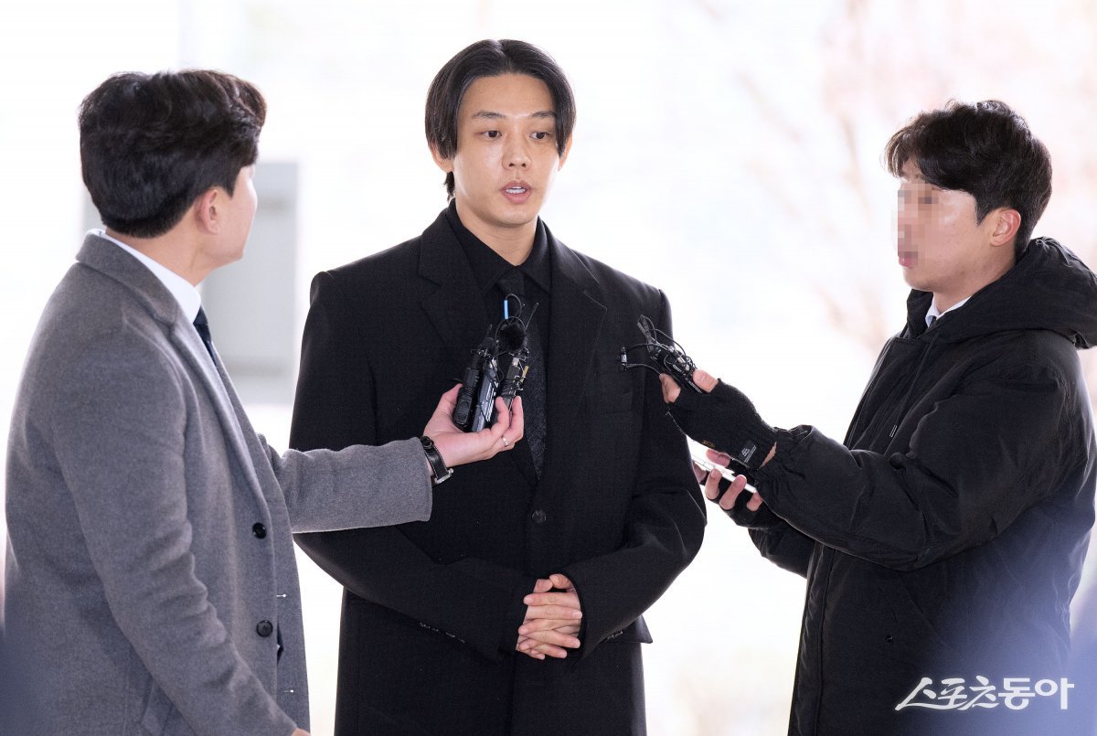 마약 상습 투약 혐의로 첫 재판을 받는 배우 유아인이 12일 서울 서초구 서울중앙지방법원에 출석해 취재진의 질문에 말하고 있다.