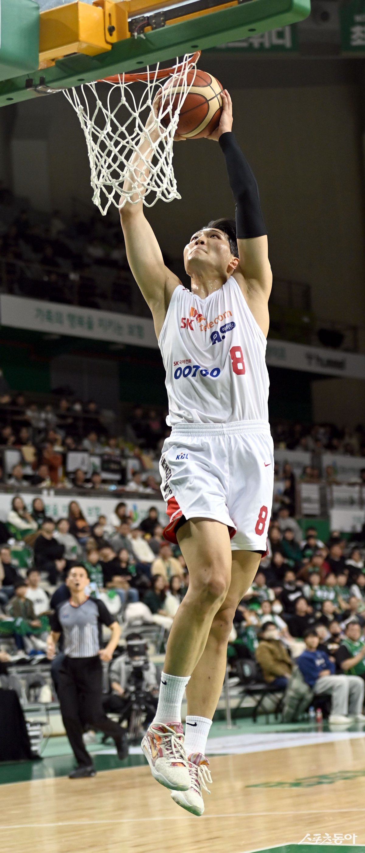 12일 원주종합체육관에서 열린 ‘2023-2024 프로농구’ DB와 SK 경기에서 SK 안영준이 덩크슛을 성공시키고 있다.