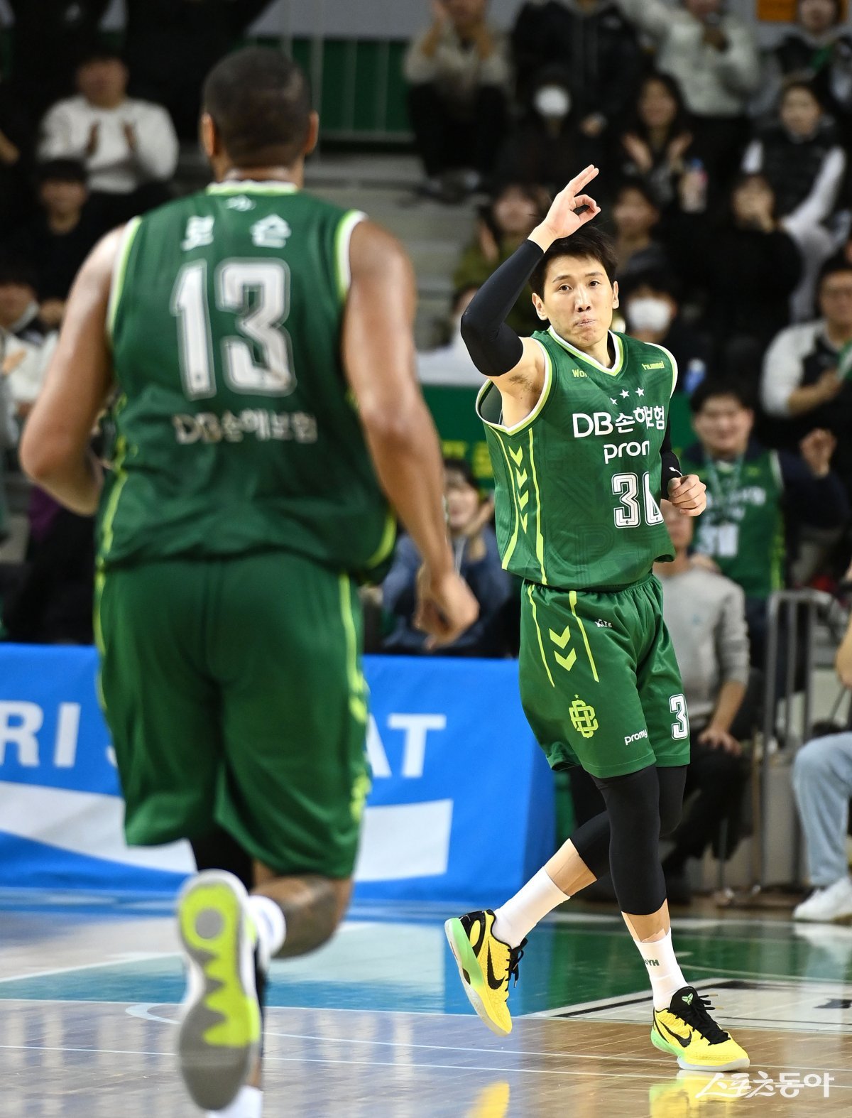 12일 원주종합체육관에서 열린 ‘2023-2024 프로농구’ DB와 SK 경기에서 DB 두경민이 3점슛을 성공시킨 후 기뻐하고 있다.