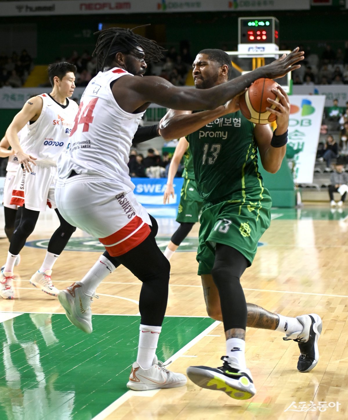 12일 원주종합체육관에서 열린 ‘2023-2024 프로농구’ DB와 SK 경기에서 DB 로슨이 SK 워니의 수비를 뚫고 골밑을 공격하고 있다.