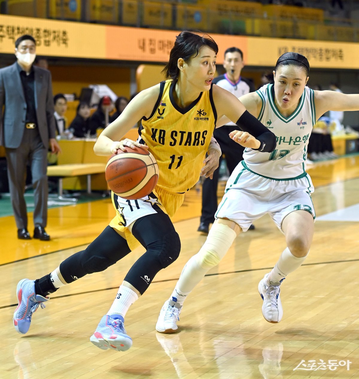 13일 청주체육관에서 열린 ‘우리은행 우리WON 2023~24 여자프로농구’ KB스타즈와 하나원큐 경기에서 KB스타즈 강이슬이 하나원큐 김정은의 수비를 뚫고 골밑을 공격하고 있다. 청주 | 김종원 기자 won@donga.com