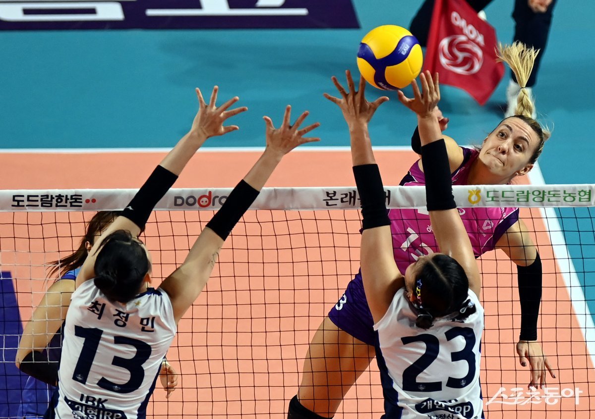 14일 인천 삼산월드체육관에서 ‘2023-2024 도드람 V리그’ 인천 흥국생명과 화성 IBK기업은행의 여자부 경기가 열렸다. 흥국생명 옐레나가 IBK기업은행 블로커를 피해 스파이크를 날리고 있다.